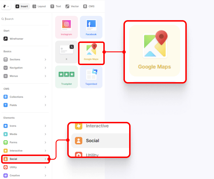 Framer intègre Google Maps nativement.